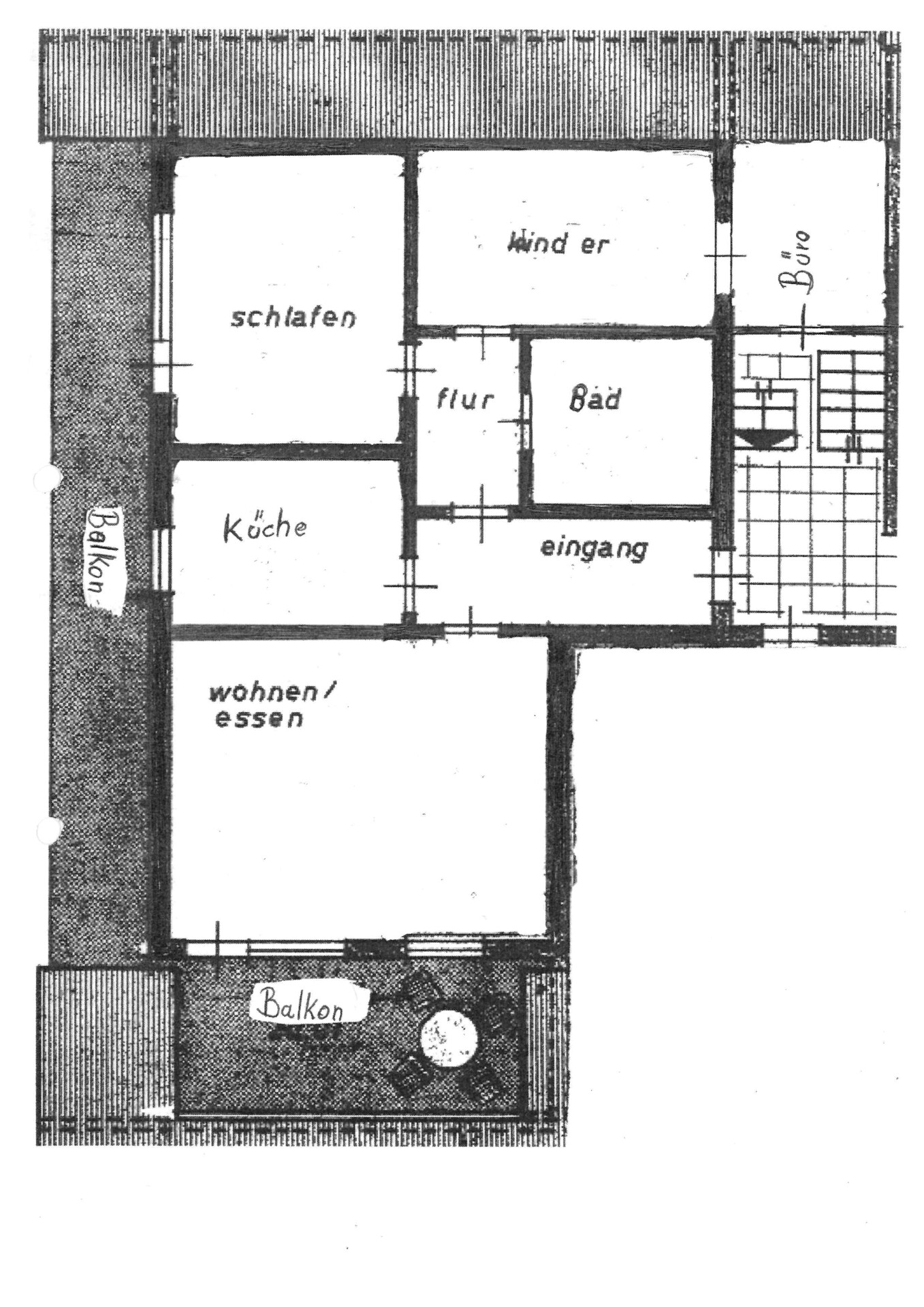 Ein kleiner Raum mit ca. 8m², eine halbe Etage tiefer gelegen, ist mit der Wohnung verbunden, ist aber auch vom Treppenhaus zugänglich. Dieser Raum kann gut als Büro/Haushaltsraum/Gästezimmer genutzt werden.