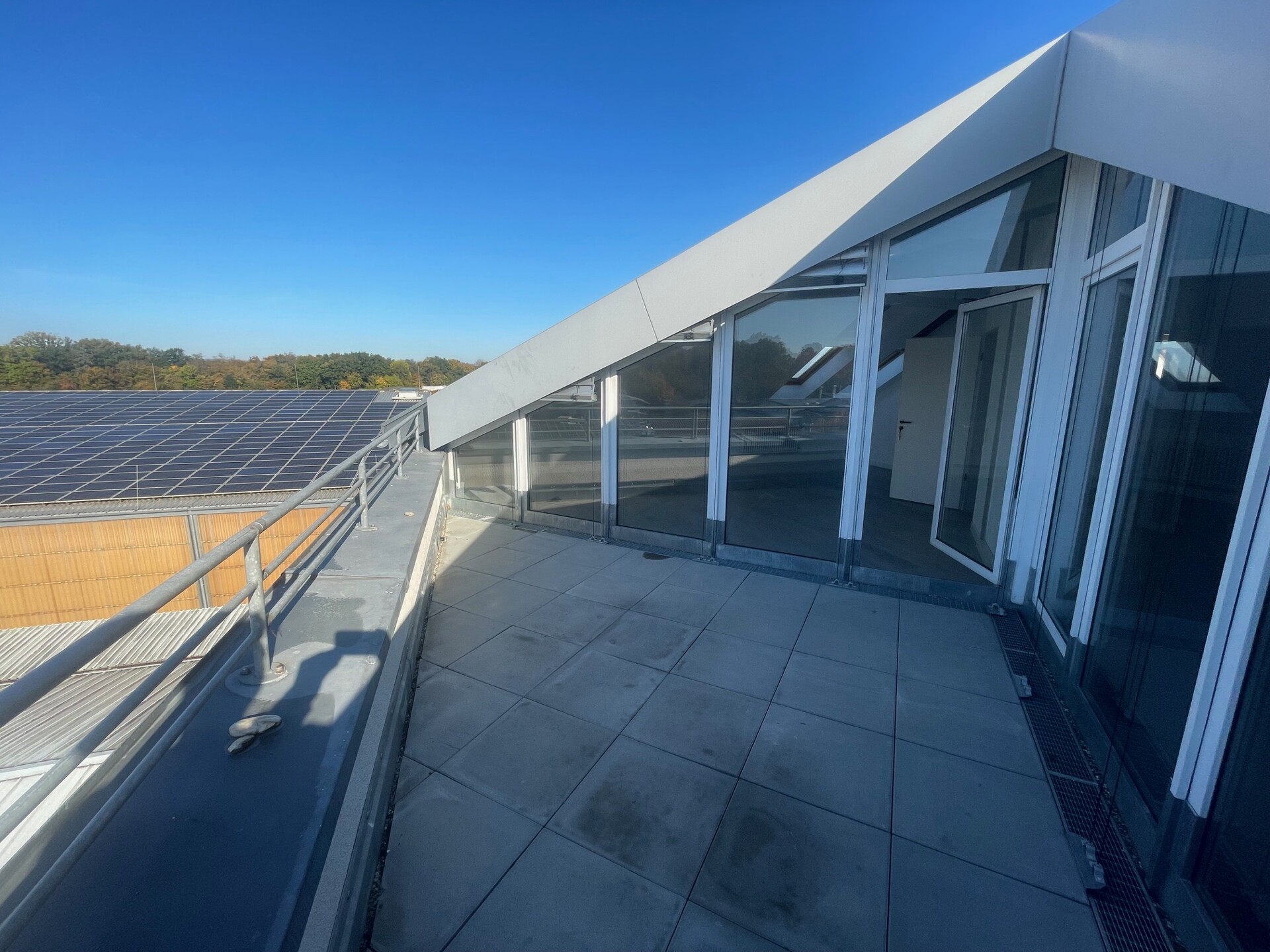 Ein besonderes Highlight ist die großzügige Dachterrasse, die nicht nur als Pausenfläche dient, sondern auch Raum für kreative Meetings oder entspannte Arbeitspausen im Freien bietet.